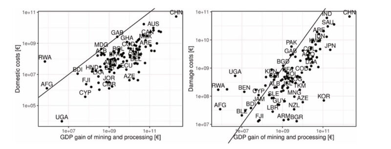 I grafici sottostanti illustrano come il guadagno del PIL derivante dall’attività mineraria si confronta con quello locale (a sinistra) e globale (danni) per i singoli Paesi. Tutti i Paesi a sinistra della linea hanno costi superiori ai benefici economici.