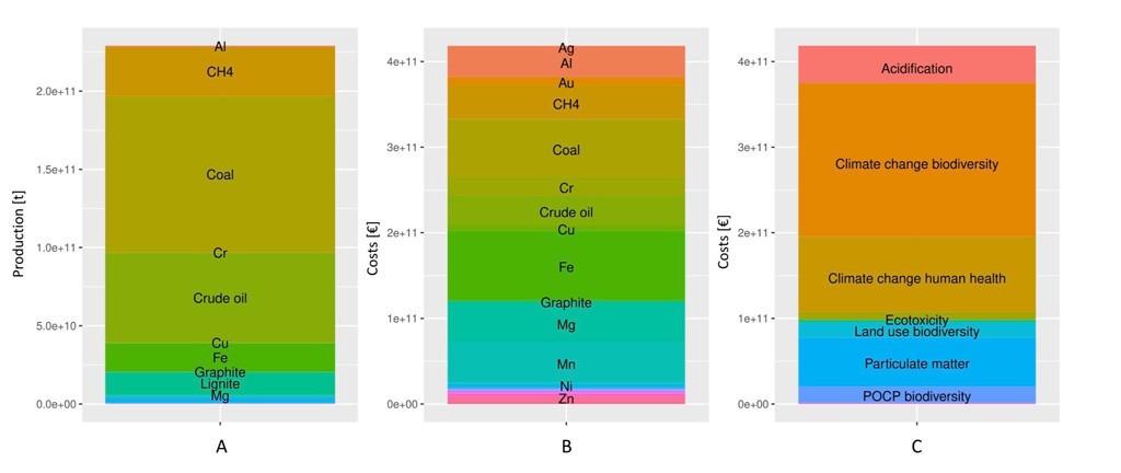 Quota di massa dei materiali (a sinistra, A) – alluminio, metano, carbone, cromo, petrolio greggio, rame, ferro, grafite, lignite, magnesio (dall’alto verso il basso); Quota di costo dei materiali (al centro, B) – argento, alluminio, oro, metano, carbone, cromo, petrolio greggio, rame, ferro, grafite, magnesio, manganese, nichel, zinco (dall’alto verso il basso); Quota degli impatti (a destra, C) prezzi in euro, stima bassa.
