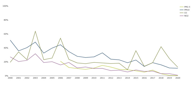 Negli ultimi anni, la quota della popolazione urbana esposta a concentrazioni di inquinanti atmosferici superiori ai valori limite dell’UE e il conseguente impatto sulla salute sono diminuiti per PM 2,5 e NO 2 (cfr. figura sopra). Per quanto riguarda l’ozono troposferico, la concentrazione di fondo nell’emisfero settentrionale sta aumentando in Europa, mentre i valori di picco globali stanno diminuendo (Andersson et al., 2017; Orru et al., 2019; Paoletti et al., 2014).